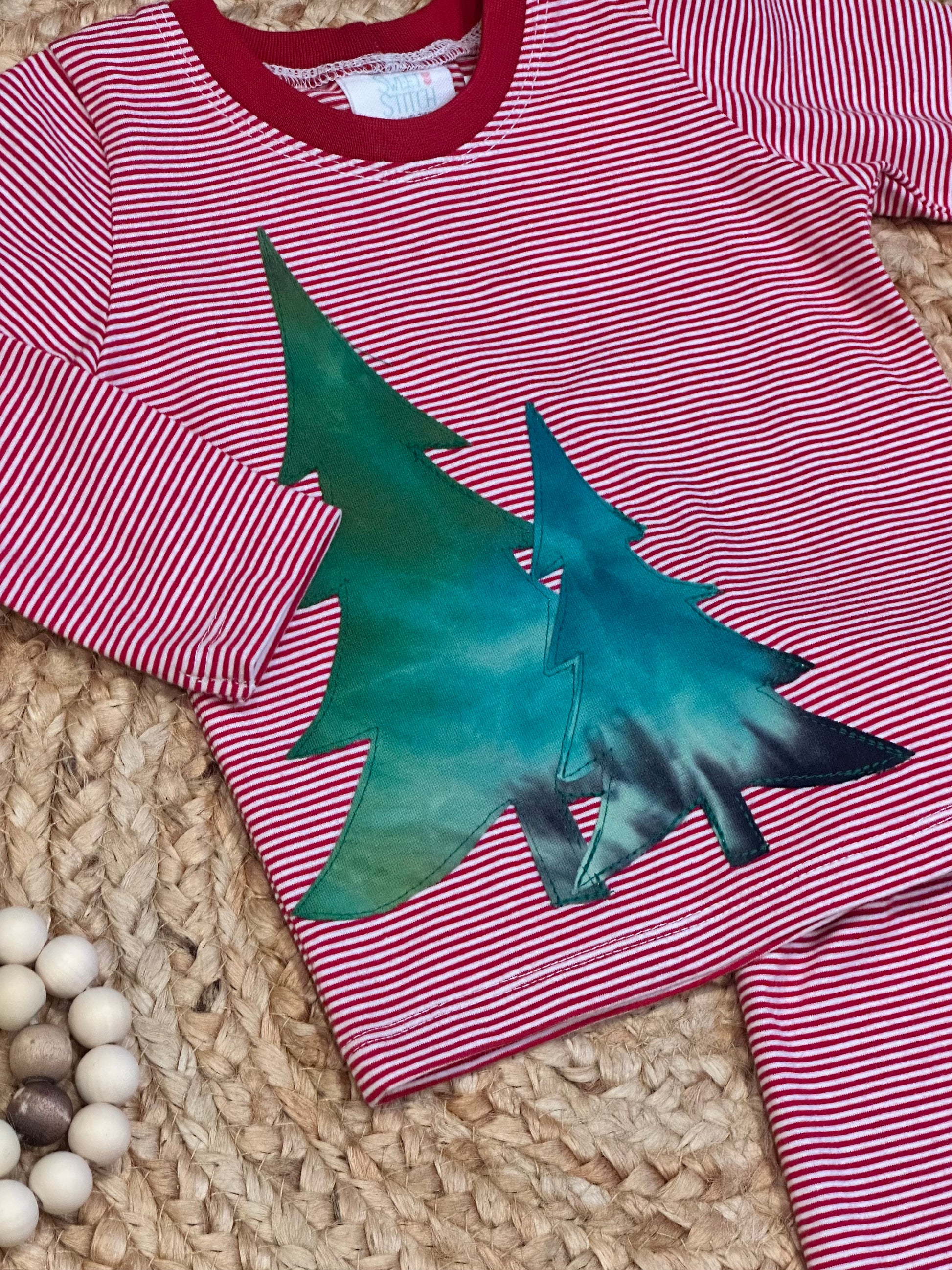The long sleeved tee features two tie dye appliquéd Christmas trees that pop against the mini red and white stripe. The matching pants feature an elastic waistband cuffed ankles. This set is made from 95% cotton and 5% spandex fabric.