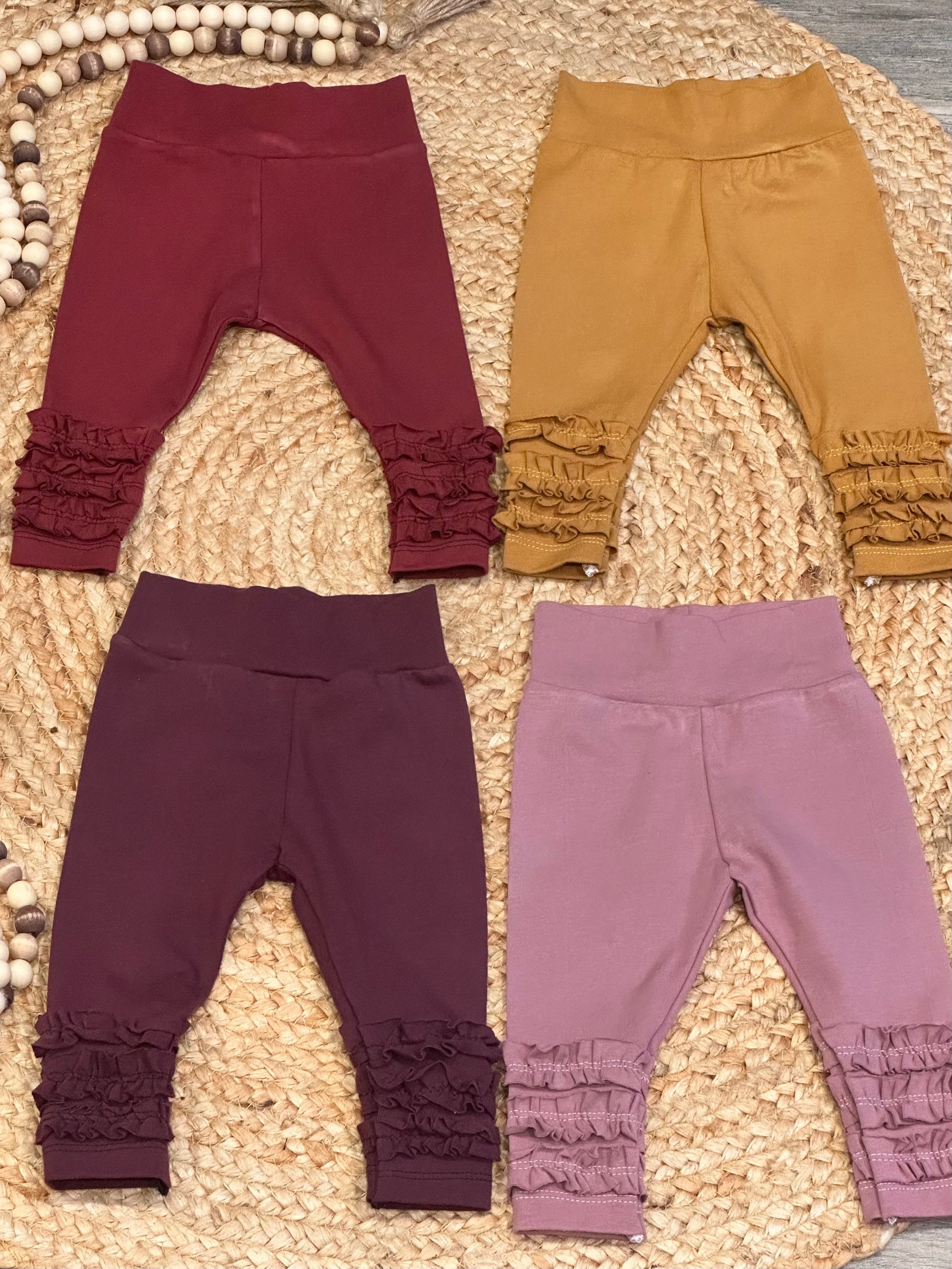 This pack of four leggings are all size 3-6m. They feature an elastic waist and ankle ruffles. Four different colors are included-cranberry, mustard, boysenberry, and old rose. Turn around time frame is 1-2 business days.